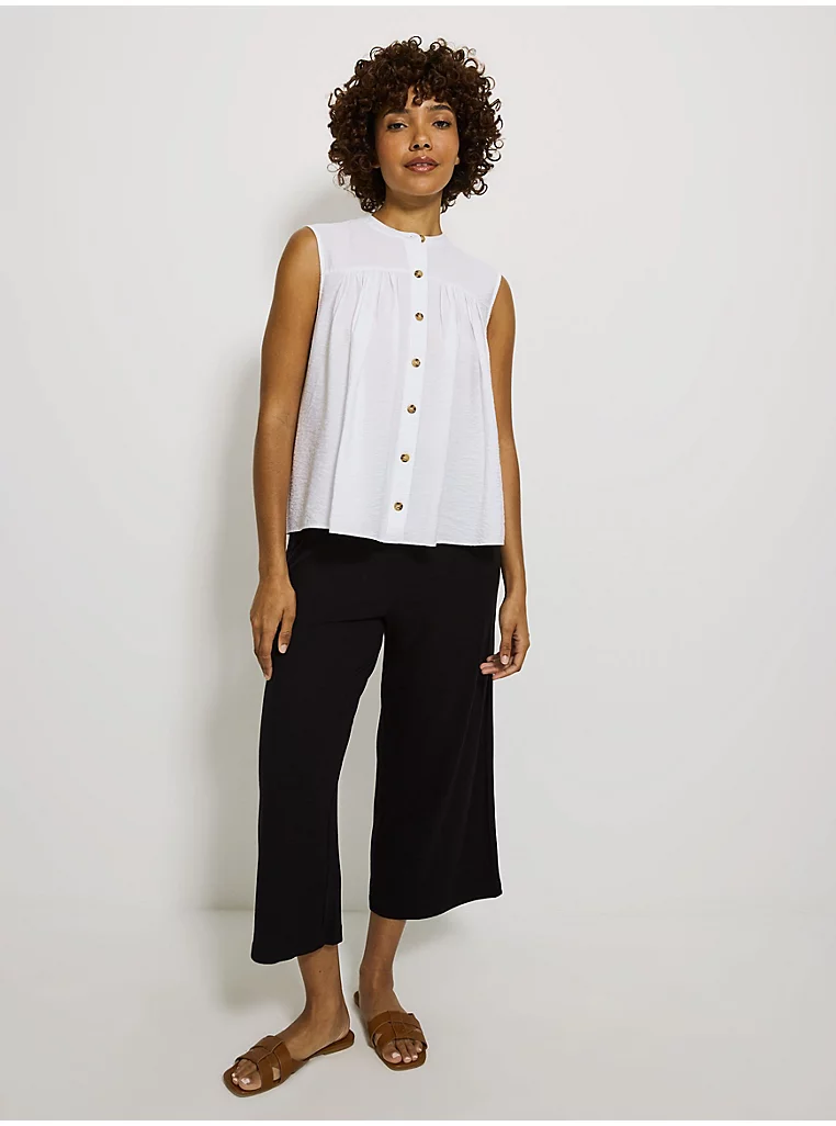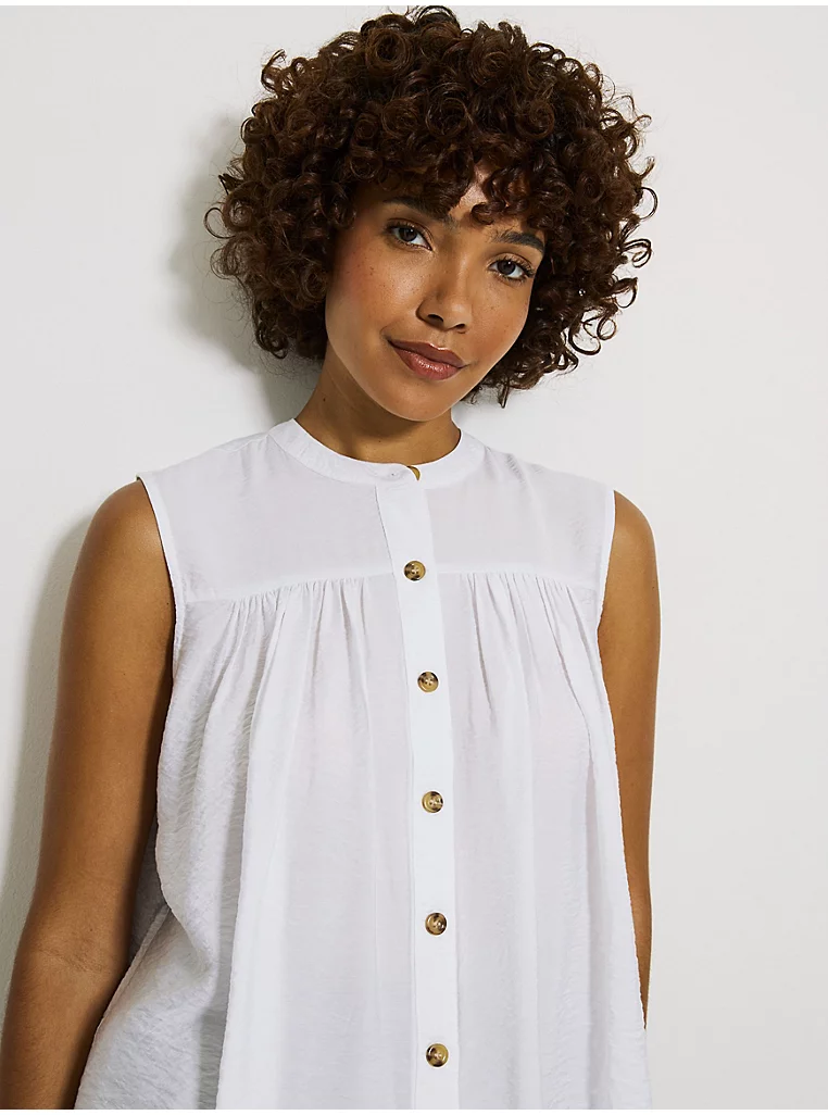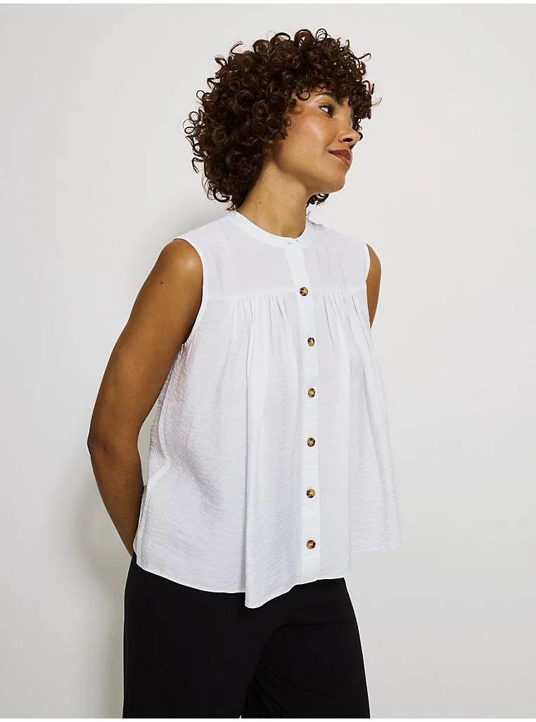 White Button Through Gathered Crinkle Blouse